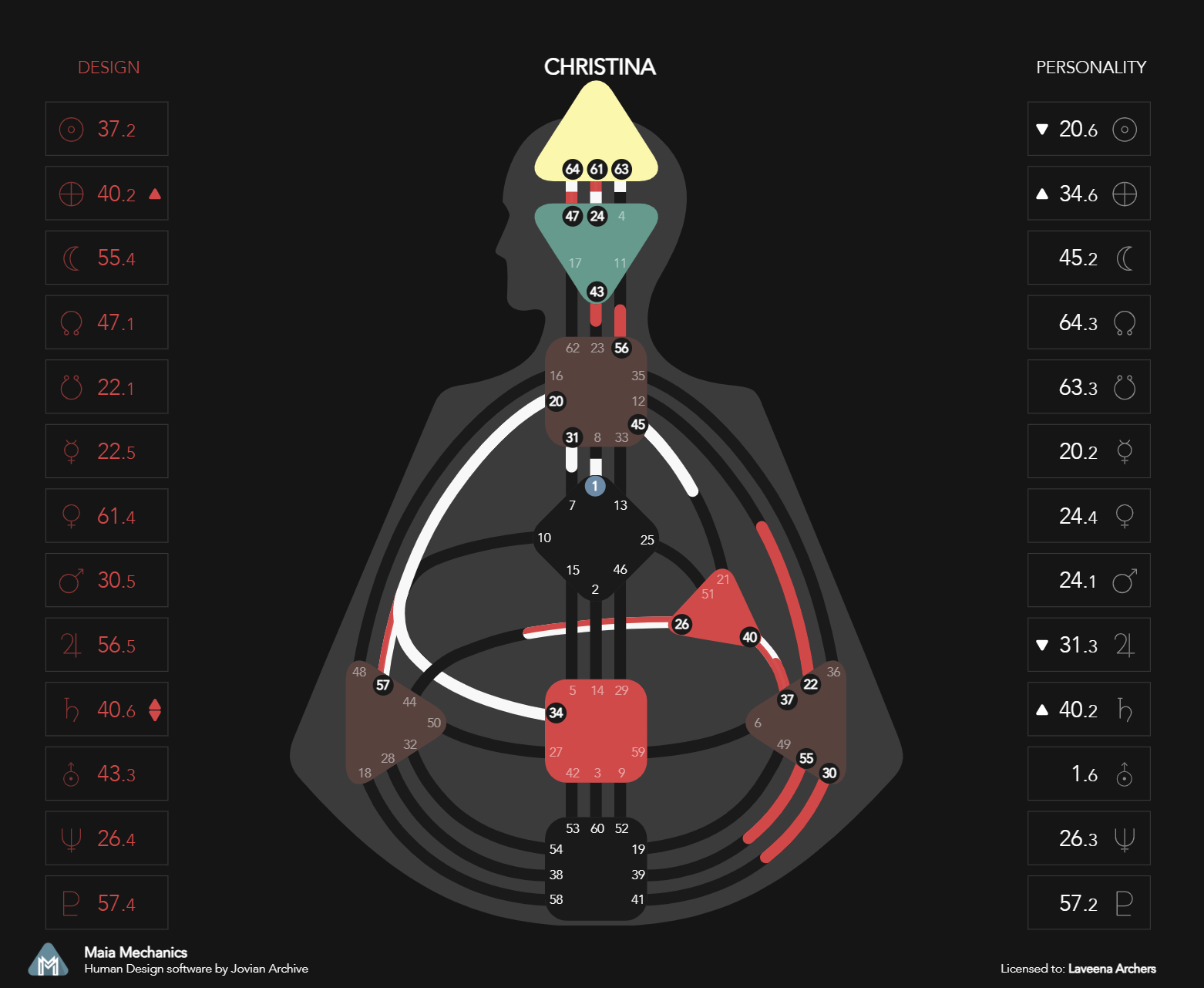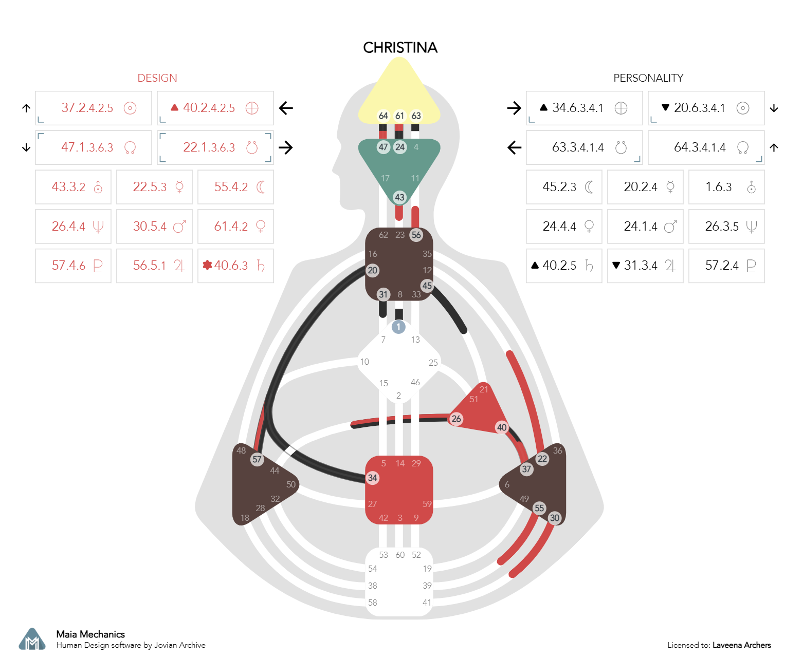 You have a mechanical uncommonness and rarity; your design is perfection, Christina; the universe does not create flaws, only perfections of uniqueness. Your Triple Split gives you the gift of broad assimilation, diverse awareness/perspectives, and the ability to support the complexity of a large amount of information by moving through groups. Sometimes its simpler for someone like you to be an entrepreneur by design.